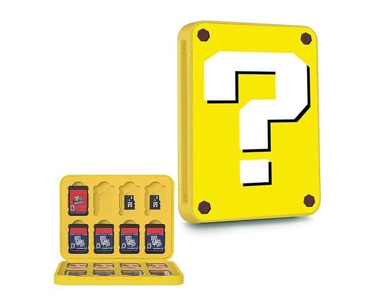 We have this case to protect your Nintendo Switch games & microSD cards with the classic [?] block design from Super Mario. Easy to put in and take out your games. This item can fit 16 games and 16 microSD cards.