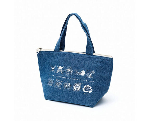 One Piece anime straw hat store Japan exclusive straw hat pirates denim fabric insulated lunch bag with zipper. The character design has the pirate flags of all your favorite characters.