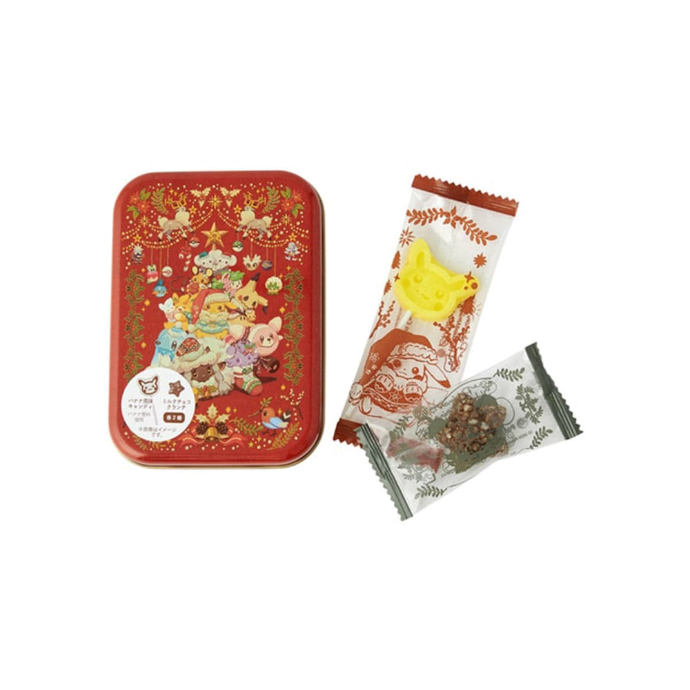 Check off stocking stuffer items with this adorable Pokemon Heartwarming Christmas Lollipop Candy & Chocolate combo! This pack includes two delightful candies - a banana-flavored lollipop and star-shaped chocolate with crunchy popped rice bits. Both candies are packed into a tin that can be reused for storing small items later. The tin and candy packaging includes a cute Christmas Pokemon design, making it even more fun to eat!