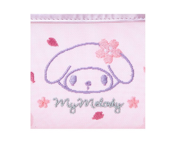 Embrace the lovely charm of My Melody embroidered on delicate mesh fabric, creating a delightful impression. Complete with a zipper charm adorned with cherry blossoms for that extra touch of sweetness.